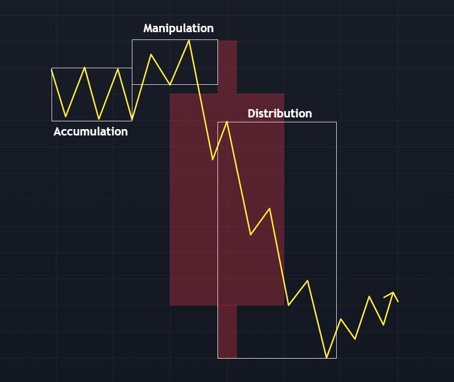 - این فاز معمولاً در زمان شروع روز یا سشن معاملاتی جدید رخ میدهد. قیمت در یک محدودهی باریک حرکت میکند و به نوعی، پول هوشمند شروع به انباشت یا توزیع سفارشات خود میکند. اغلب، این مرحله با شکار نقدینگی زیر یا بالای قیمت باز شدن روز آغاز میشود.